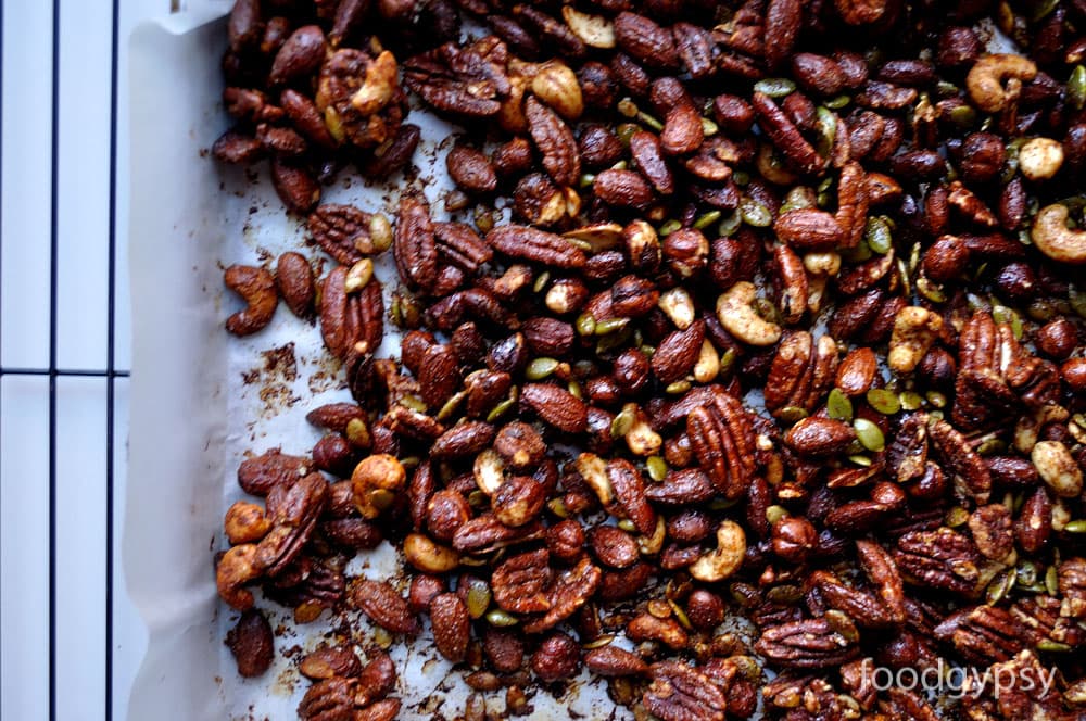 Our favourite nut mix: cashews, almonds, pecans, hazelnuts, and pumpkin seeds. Use them in any combination you like. Not a big fan of walnuts with this recipe due to the bitterness. The spiced candy coating can’t overcome walnuts, so we stick to the smoother, sweeter nuts.