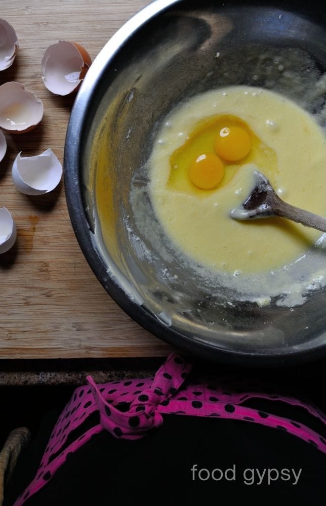 Add eggs, one at a time, beating in between, to fully incorporate into batter.