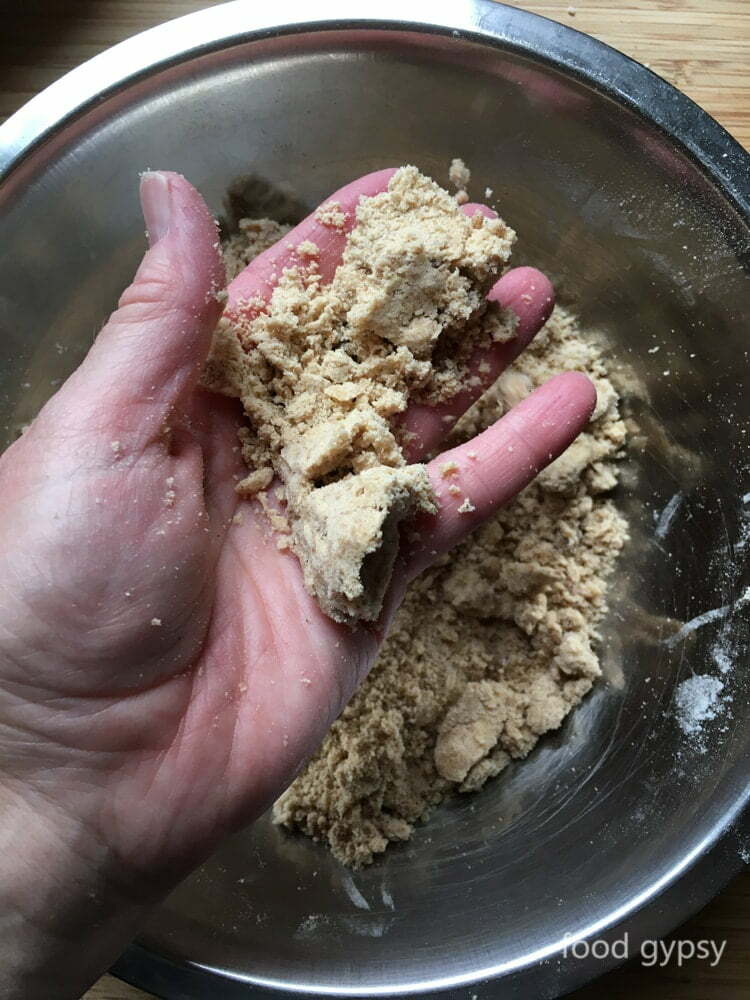 - In a separate bowl, combine cinnamon, flour sugar and cold butter to make topping. Cut together with two knives or with dry hands. The crumble should look like sand, and when pressed together should easily bind together. Some prefer a less sweet version and you can certainly halve this part of the recipe to cut the the sugar. Me, I’m full sugar, Baby!
