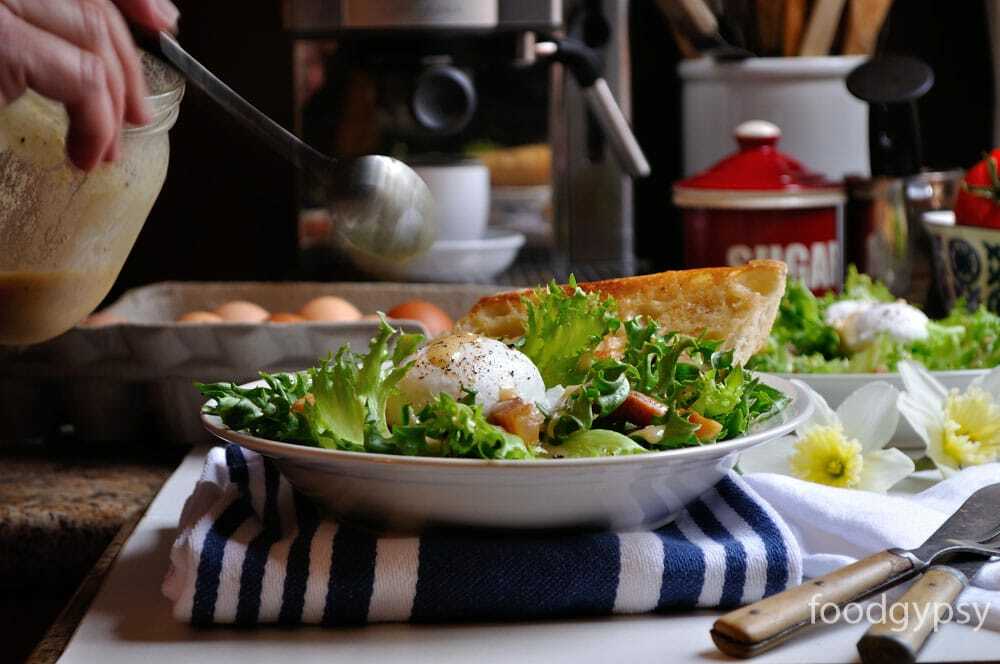 - Place scattered lardons on the bed of lettuce, toward the outside of the plate, dividing evenly between plates. Lightly drain eggs and place in the center of lettuce bed, up to two per plate. Finish with extra vinaigrette and toasted baguette. and serve… immediately.