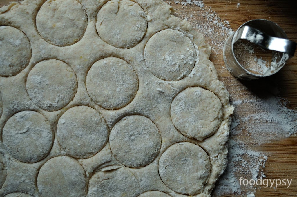 2. Make your cobbler topping. In a large bowl first, combine sugar and lemon zest and mix. Then add dry ingredients (flours, sugar, baking soda & salt ) along with lemon sugar and whisk to combine. Grate the cold butter into the flour mixture and then rub with fingertips to combine to a peameal consistency. Add heavy cream and mix with a spatula until a dough begins to form, then kneed by hand to combine (just a couple of times) being careful not to overwork the dough. Dust counter lightly with all-purpose flour, turn the dough out onto the floured surface and press into a round, flat disk about 3/4 of an inch thick. Using a sharp, well-floured round cookie or biscuit cutter, cut dough into even circles between 11/2 – 2 inches in diameter.